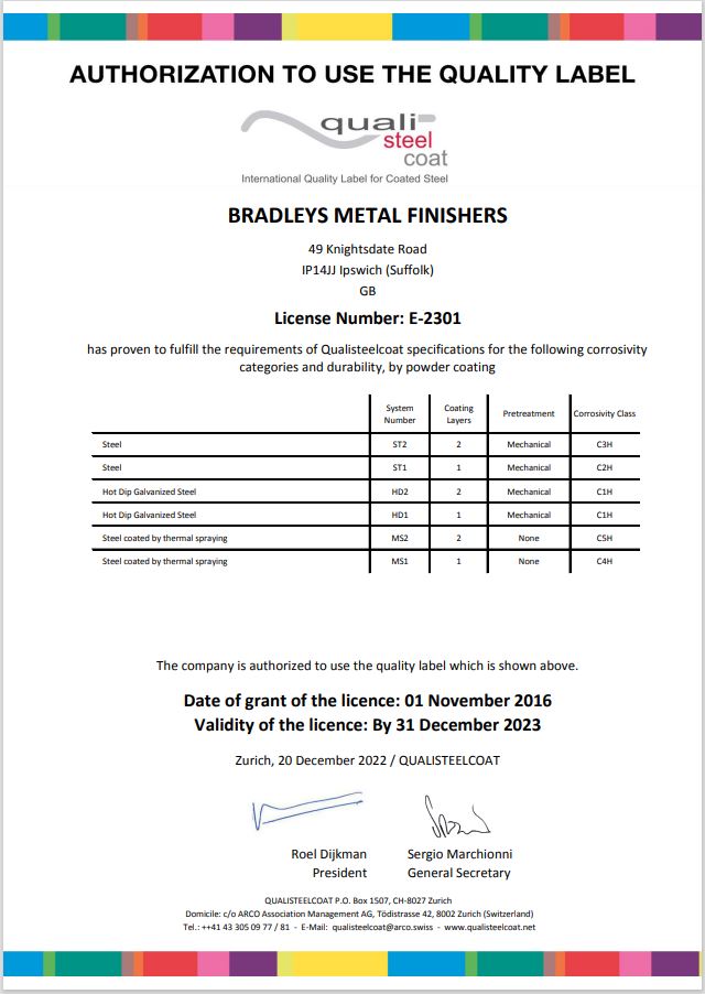 As a specialist in metal finishing, we’re honoured to have been awarded Qualisteelcoat accreditation for the 6th year in a row. It’s the International Gold Standard in coating systems for steel, providing the highest levels of quality assurance to our customers.