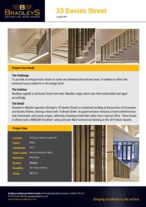 Situated in Mayfair opposite Claridge’s, 33 Davies Street is a landmark building at the junction of Grosvenor and Davies Streets, sharing a block with 73 Brook Street. Its grand entrance features a hand-crafted bronze stair balustrade, each piece unique, reflecting a boutique hotel feel rather than a typical office. These Grade A offices hold a BREEAM ‘Excellent’ rating and won Best Commercial Building at the 2014 Brick Awards.